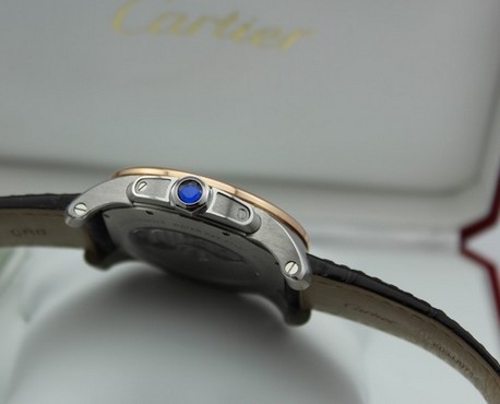 The crown (winding knob) on fake watches often has poor plating and uneven surfaces. At SwissReplicaClub.com, our Super Clone Cartier crowns are individually milled and hand-polished, including the embedded synthetic sapphire, matching Cartier's specifications in size, color, and shape.