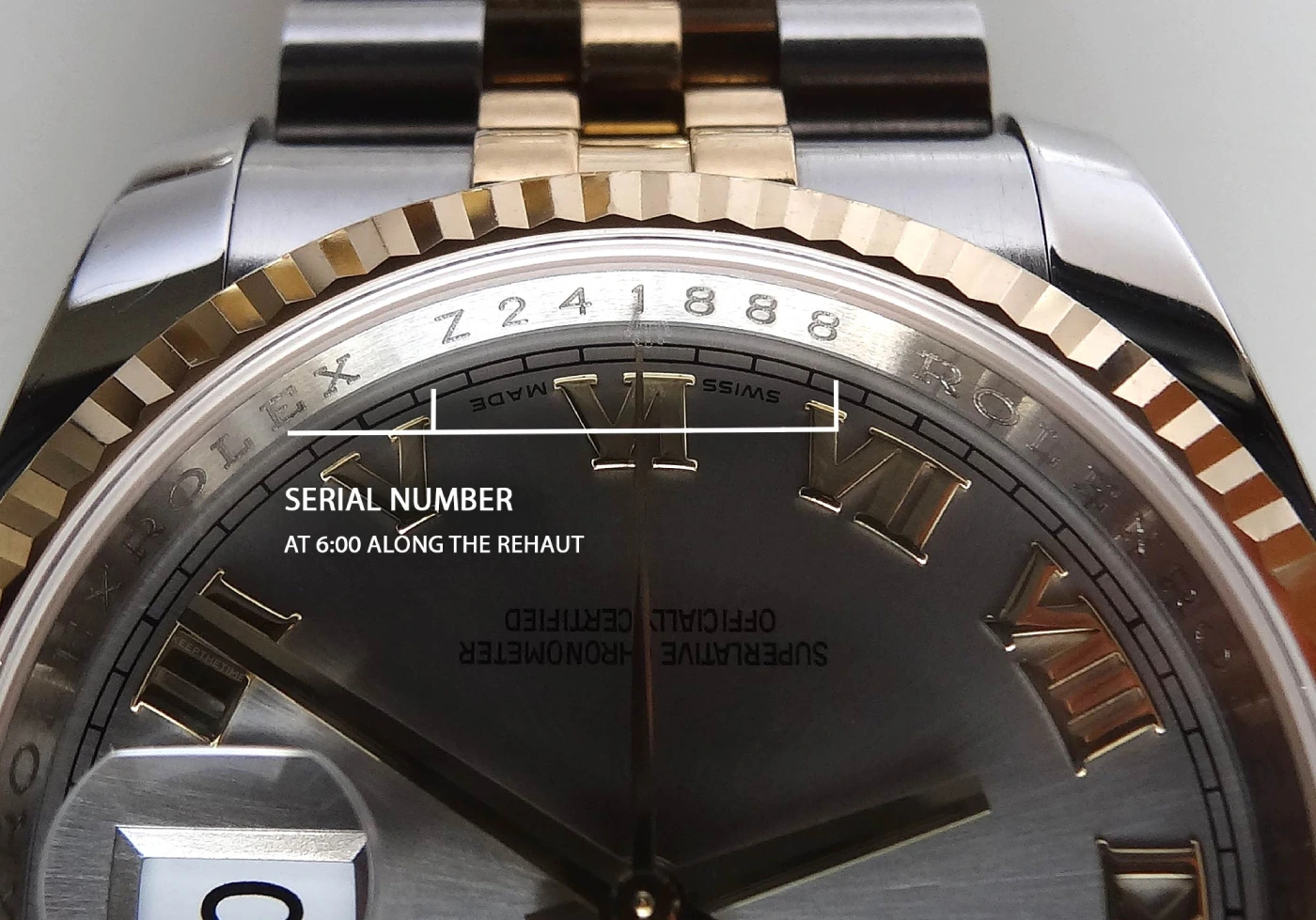 Modern Rolex (2005-Present): Rolex moved the serial number to the rehaut (the inner rim of the dial) at 6 o'clock. This "rehaut engraving" is visible without removing the bracelet.