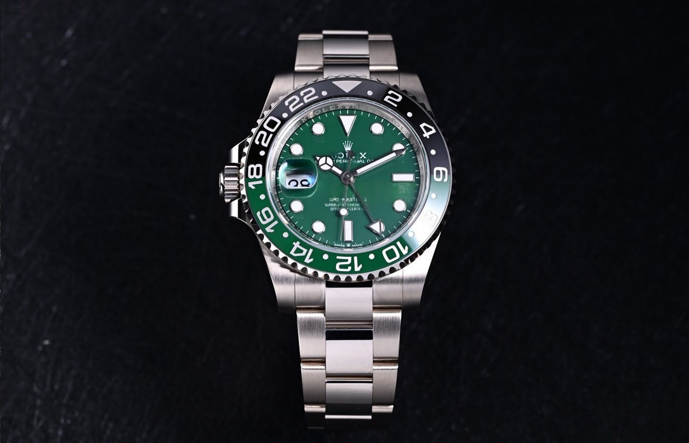 The Rolex GMT-Master II is well known for its signature Cerachrom bi-color ceramic bezel. This design divides the 24-hour scale into two contrasting colors, making it easy to distinguish day from night at a glance. In 2022, Rolex introduced the green and black bezel, affectionately nicknamed the "Sprite" by enthusiasts. Originally available only in Oystersteel cases, the luxurious 18K white gold version of the "Sprite" bezel is now officially launched, bringing a new level of elegance with precious metal craftsmanship.